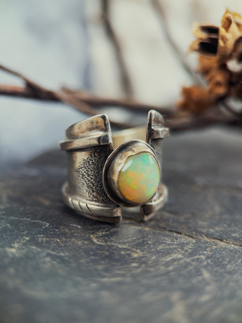 This ring holds that knowing. Ethiopian opal at its center, catching light from every angle, revealing inner fire that shifts between fiery reds, deep blues, and radiant greens. No two are the same because you're not the same person twice. The band is textured and substantial, with handcrafted details that say this isn't delicate. This is built to last. This is built for someone who knows their own worth.