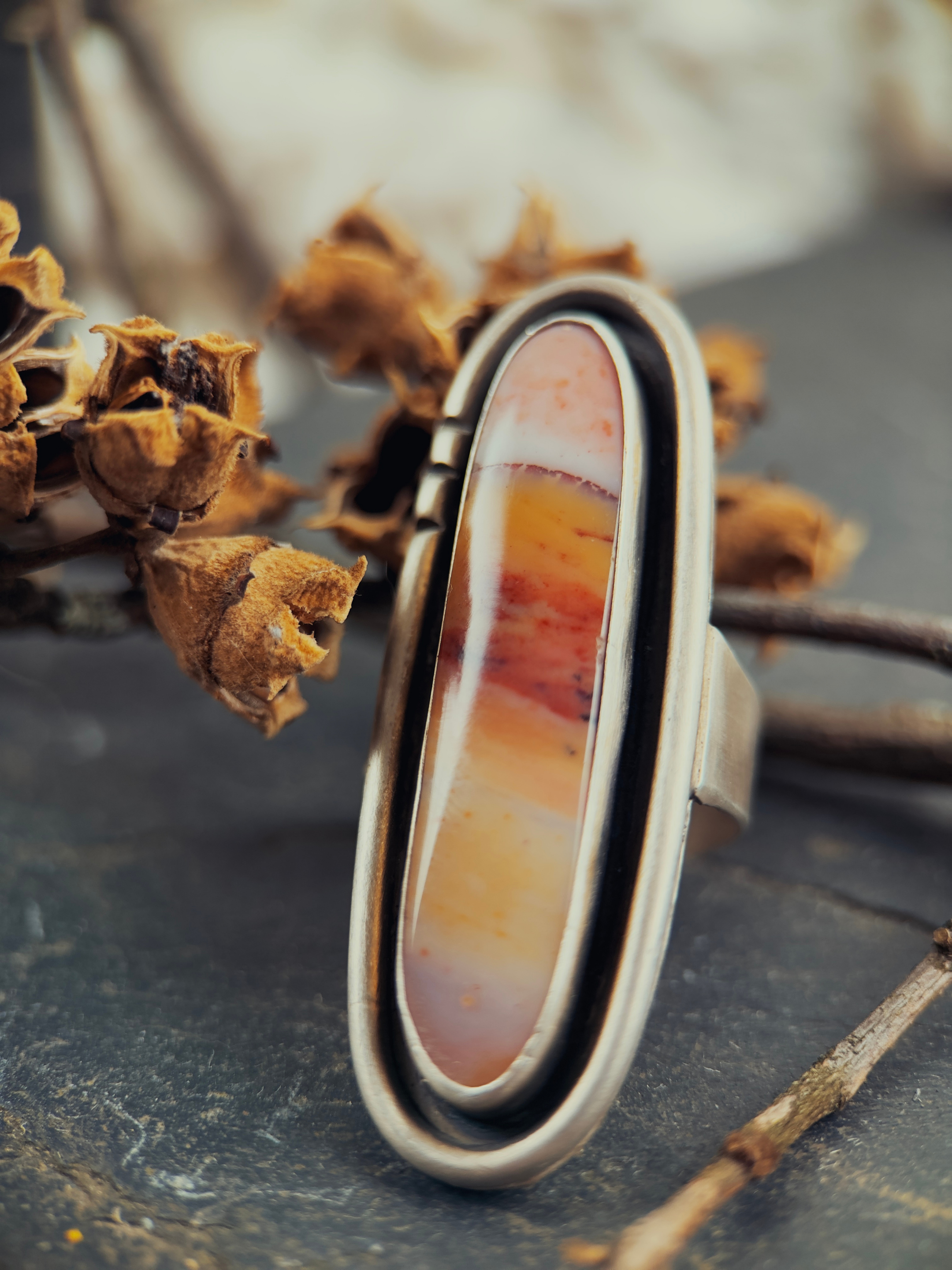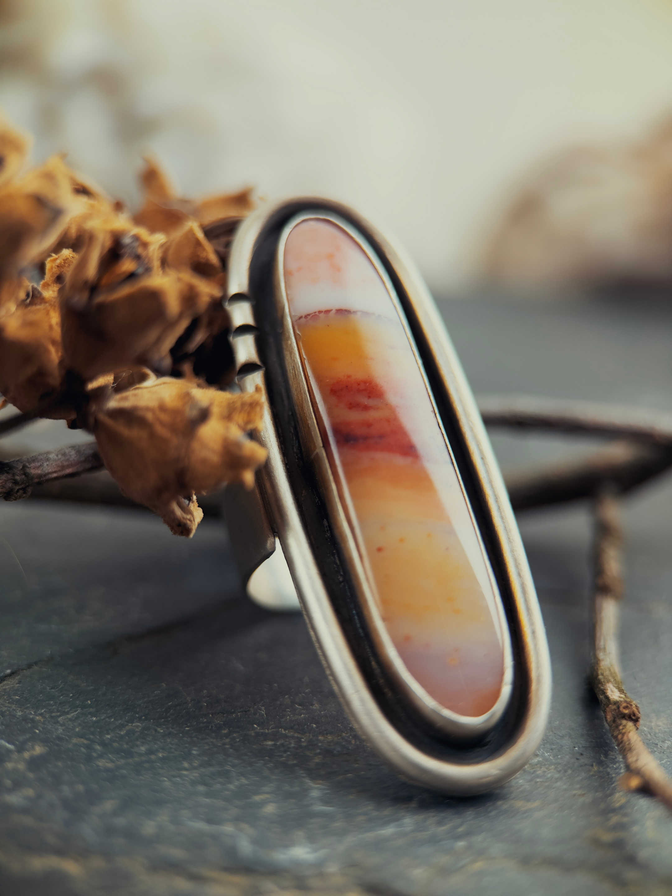 This ring holds that knowing. Paiute stone in soft pinks and creams with hints of red, like the desert at sunset, like stone that's been shaped by wind and time. Long and slender, it sits on your hand like something that's always belonged there. Sterling silver in matte finish frames it simply, letting the stone be exactly what it is. No polish. No performance. Just earth and silver and you.