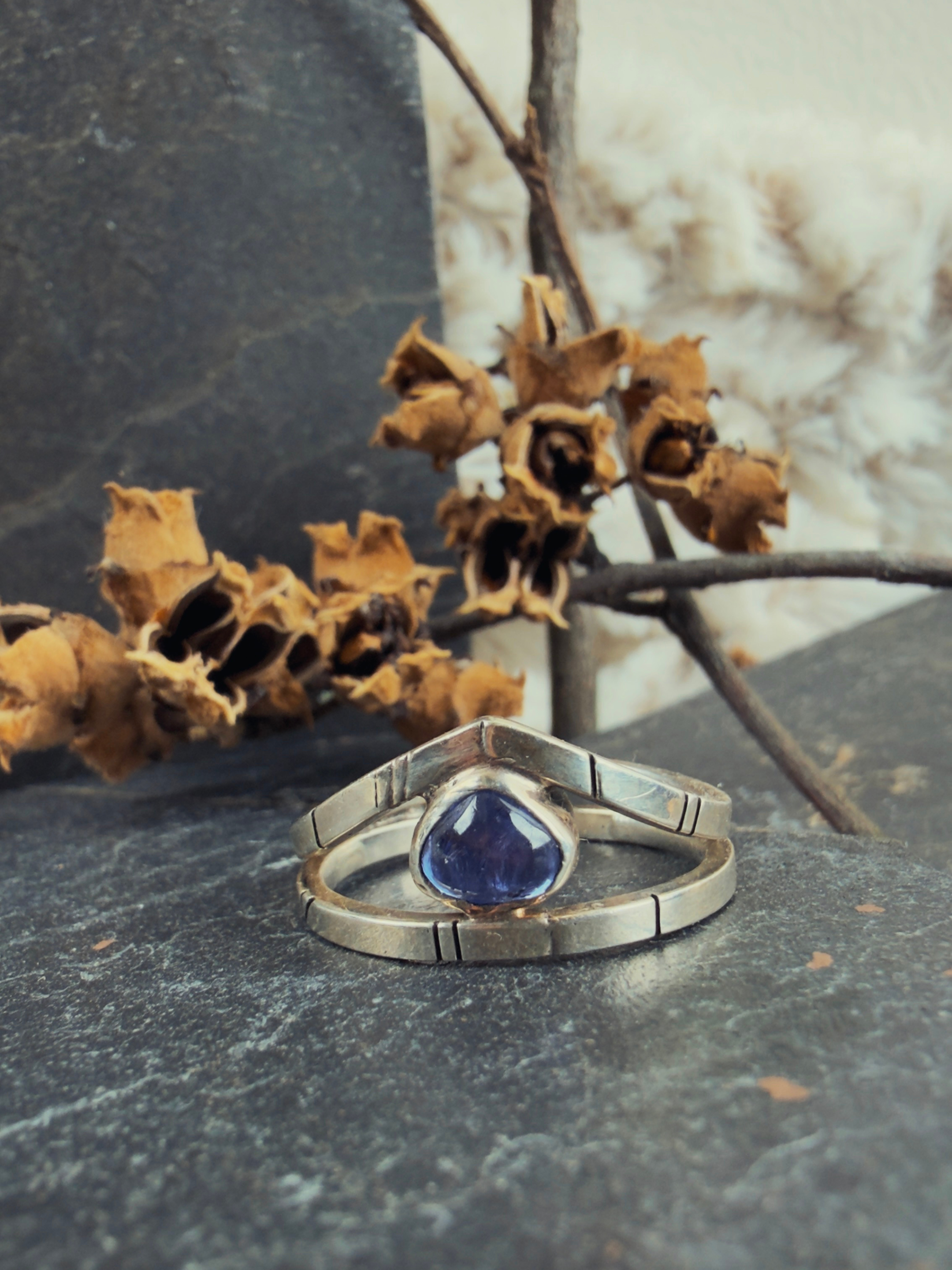 This ring holds that clarity. Tanzanite in sterling silver, high polish, catching light and revealing what's been hidden. The stone shifts between violet and blue depending on how you look at it. Nothing static. Everything revealing itself as you move through the world. The silver grounds it, polished enough to catch light, substantial enough to remind you of what you carry.
