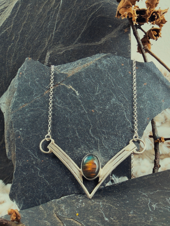This necklace holds that moment. Labradorite sits at the center of a sharp, directional silver frame, and as you move, the stone flashes blue and gold like clarity appearing exactly when it's needed. The angular shape isn't soft or decorative. It points. It directs. It says you're moving toward something real, even if you can't see the whole path yet.