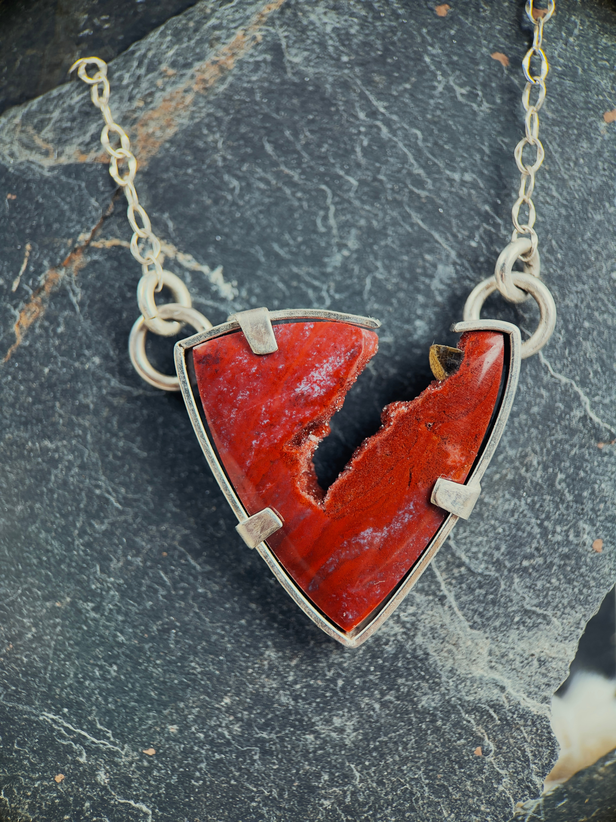 This necklace holds that moment. Red jasper with a live, unpolished edge sits at the center of a sharp silver frame, marked by the raw line where stone met heat and pressure. At its heart is an opening, an intact moment that could have shattered but didn't. That's not a flaw. That's proof. A small piece of pyrite catches light like embers, like the fire that ran through you and left you standing.