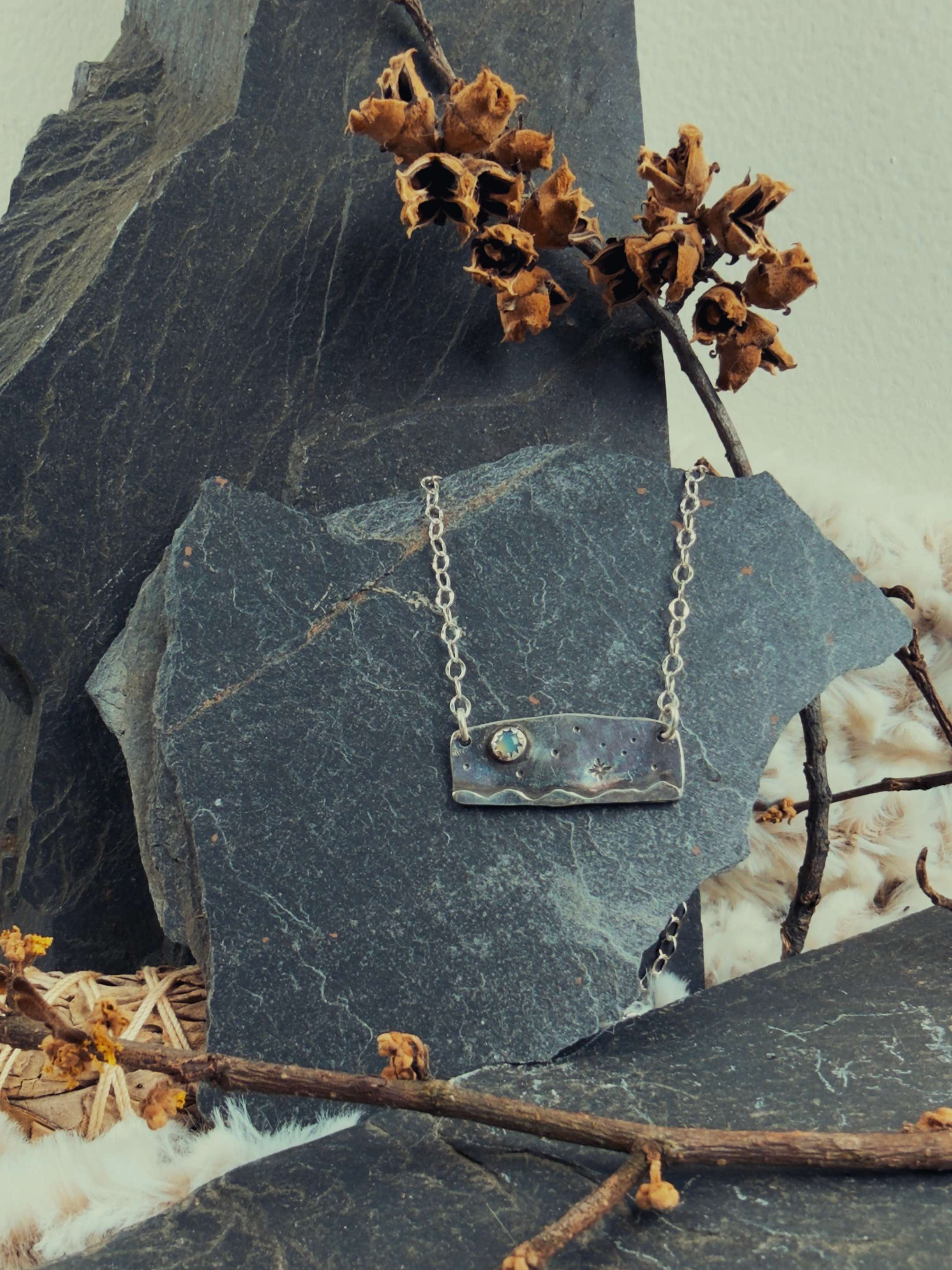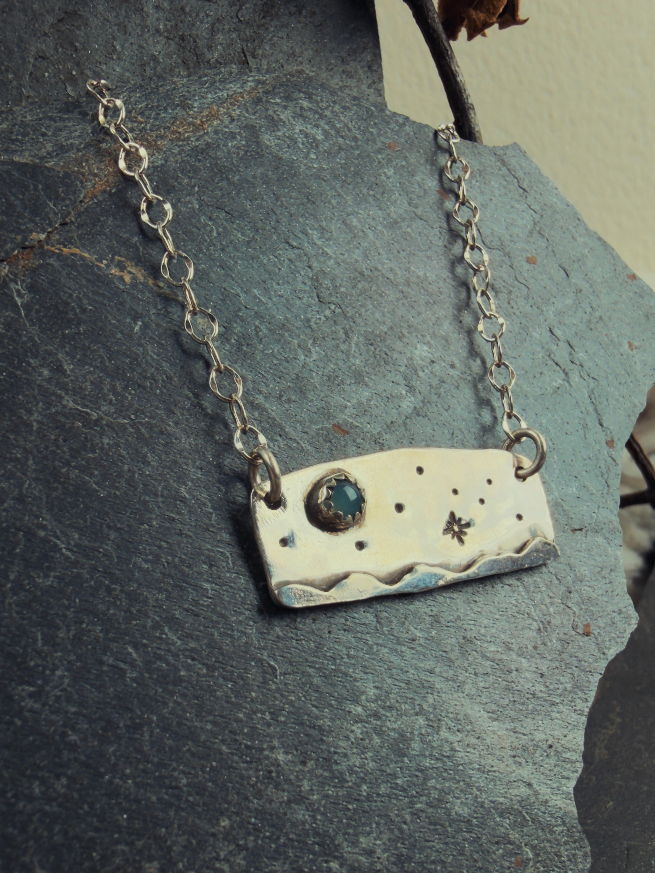 This necklace captures that moment. Hand-textured silver holds a mountain range at its base with stars scattered above, like light breaking through night sky. Blue chalcedony sits at the peak of the mountain, a gentle glow like the last trace of light as it fades across the horizon. It sits close to your skin like a fragment of that exact moment frozen in time. It's a talisman and a reminder both, something to touch when you need to feel the turning, the passing, the constant becoming that's happening inside you even when the outside world looks still.