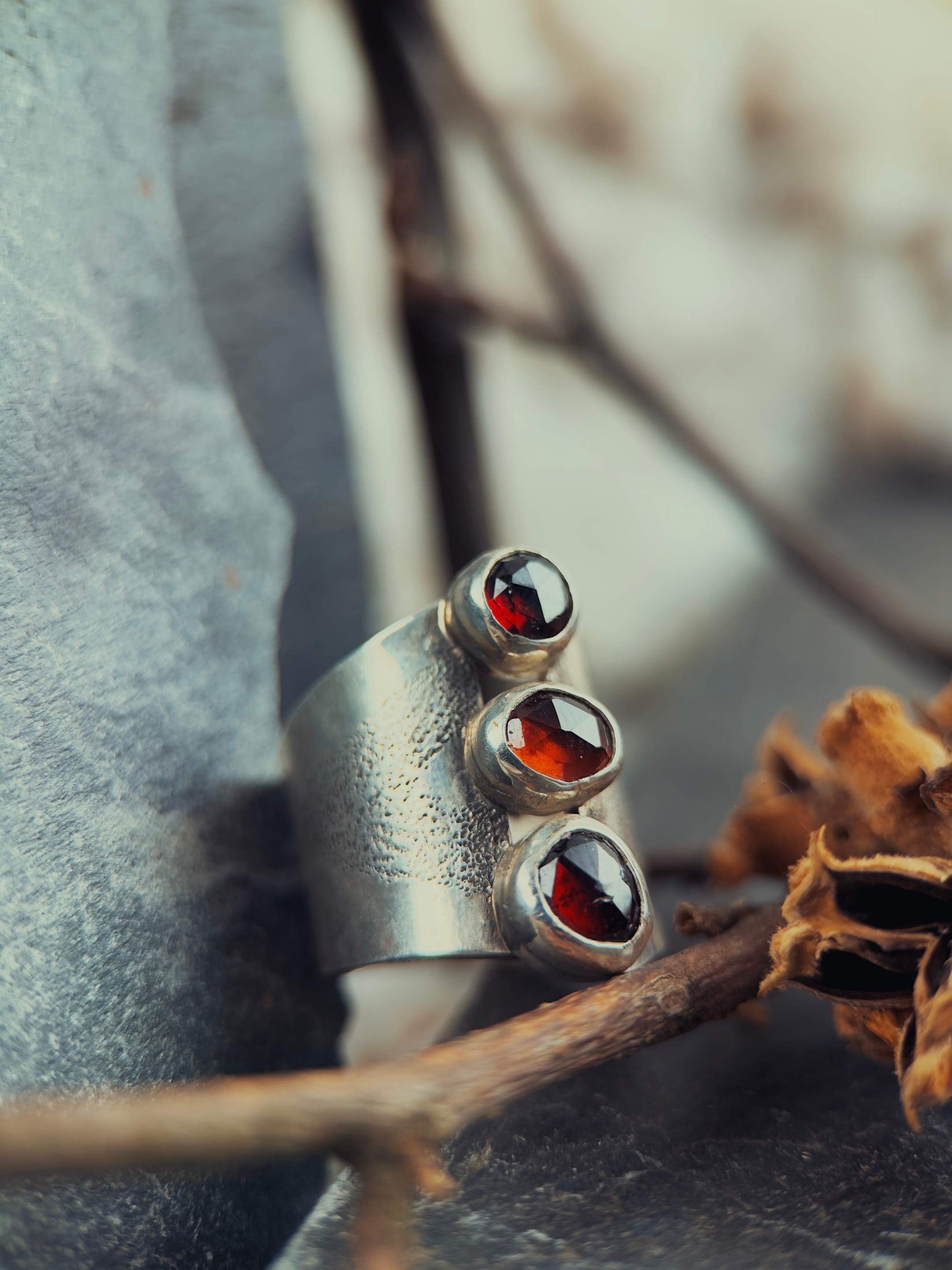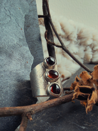 This ring holds that power. Three faceted garnets in deep red, each one hand-formed and set with intention. The wide sterling silver band is textured and raw, creating contrast that says this isn't polished perfection. This is strength. This is resilience. This is you, unapologetic and burning.