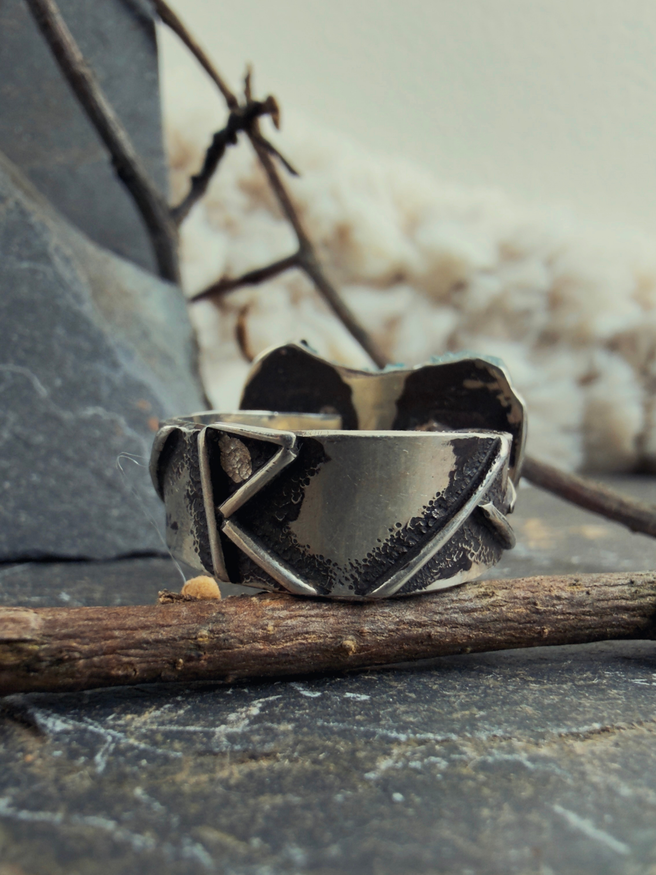Features: Raidho rune incorporation, wide textured band