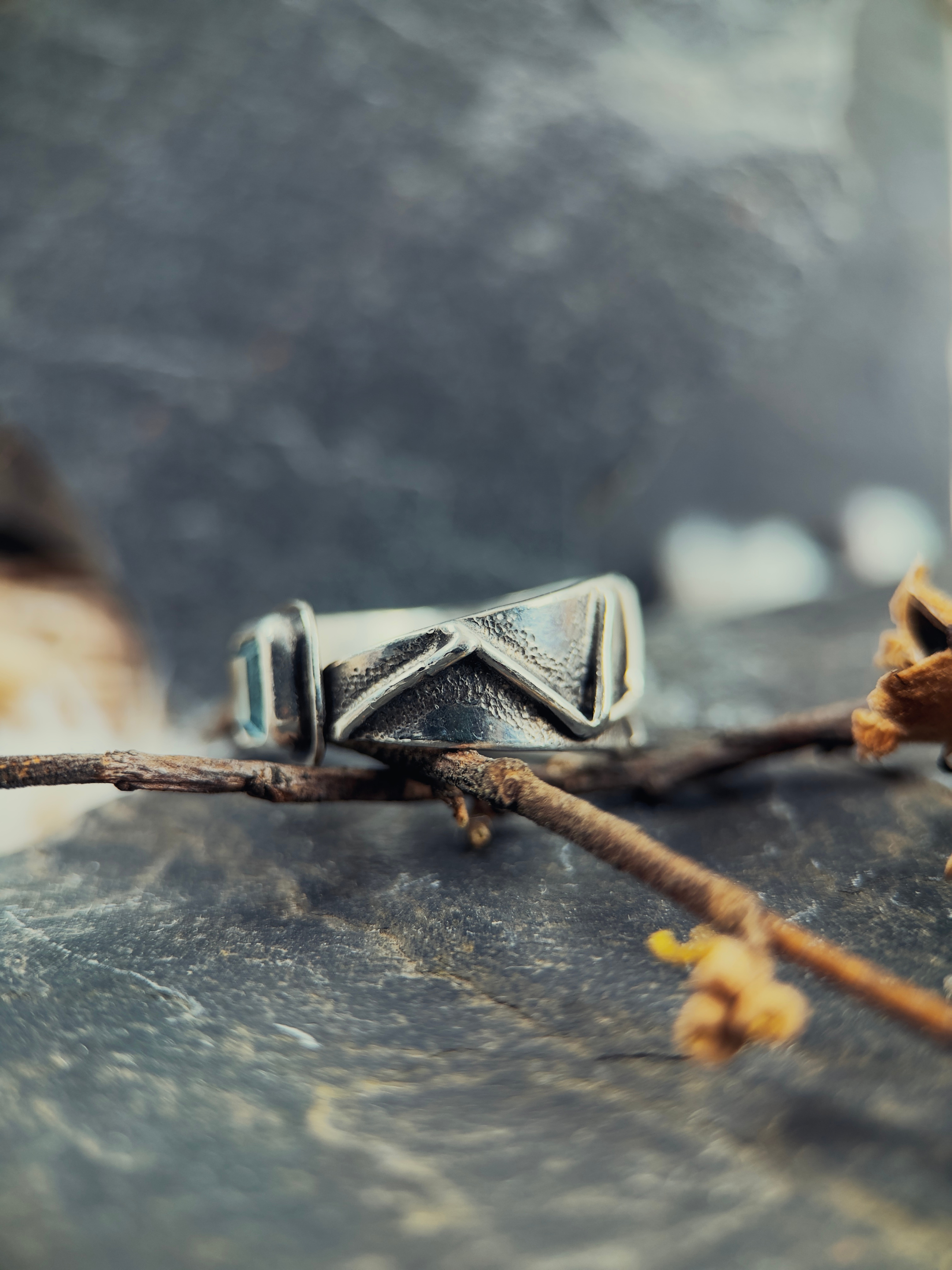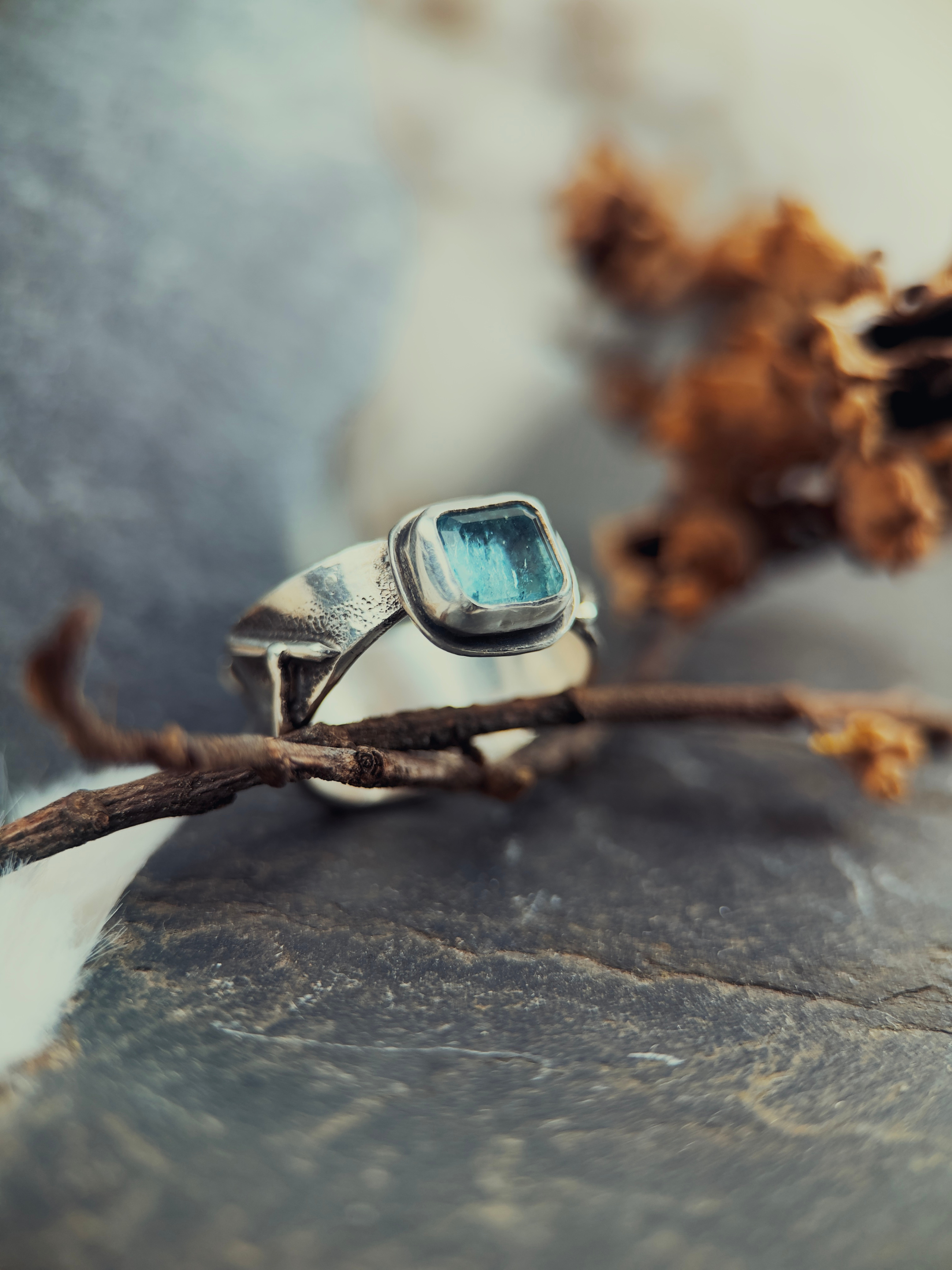 This ring holds that knowing. Raw aquamarine at its center, pale and luminous like the ocean itself. The band is textured and organic, wide in some places and thin in others, mimicking the way tides reshape the shoreline. Nothing symmetrical. Nothing forced. Just the natural way time and pressure create beauty.