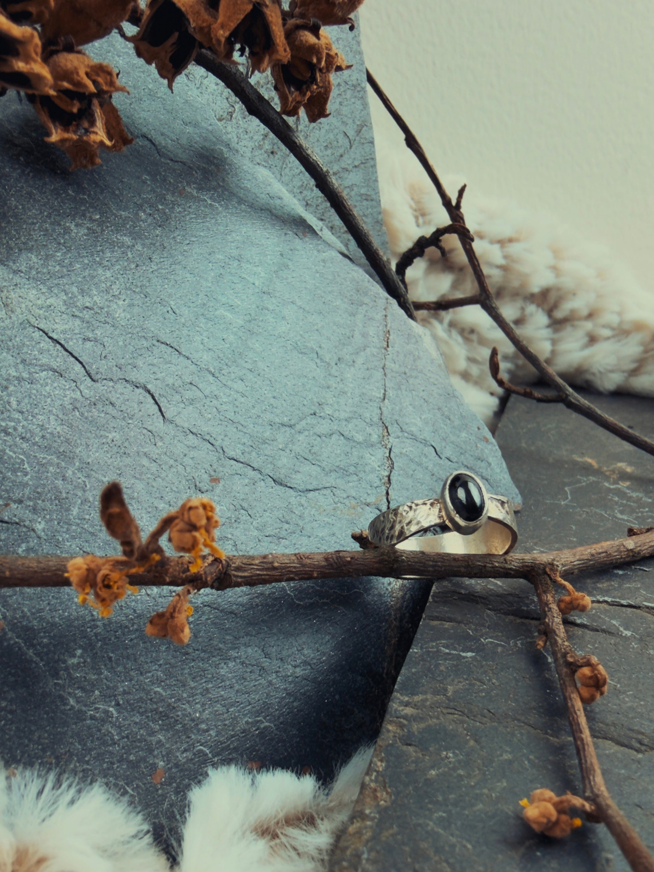 This ring holds that knowing. Black star sapphire sits at its center, deep and absolute, with that single star that only reveals itself when you're paying attention. The band is textured, weathered, like it's been through something and came out stronger. It's not polished. It's real.