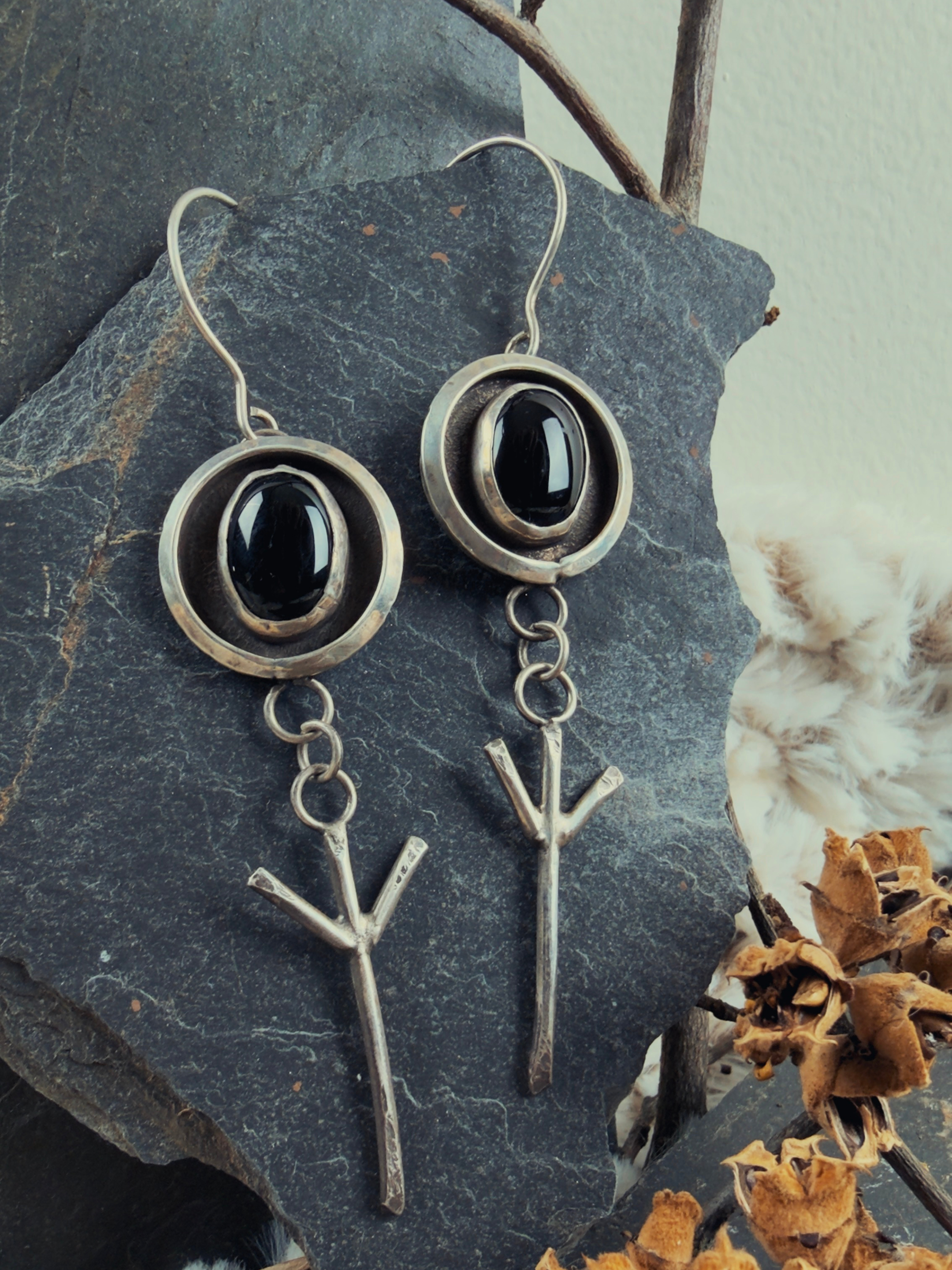 Ces boucles d'oreilles en onyx et runes allient simplicité et élégance, avec une paire de pierres assorties, sélectionnées sur mesure par vos soins, serties dans de l'argent fin et de l'argent sterling. Chaque boucle d'oreille est ornée d'une rune personnalisable de votre choix (Fehu, Algiz, Othala ou Tiwaz), vous permettant de créer un accessoire personnel et significatif. Que vous préfériez l'onyx noir, le grenat, le quartz fumé ou une autre pierre, ces boucles d'oreilles sont conçues pour refléter votre individualité.