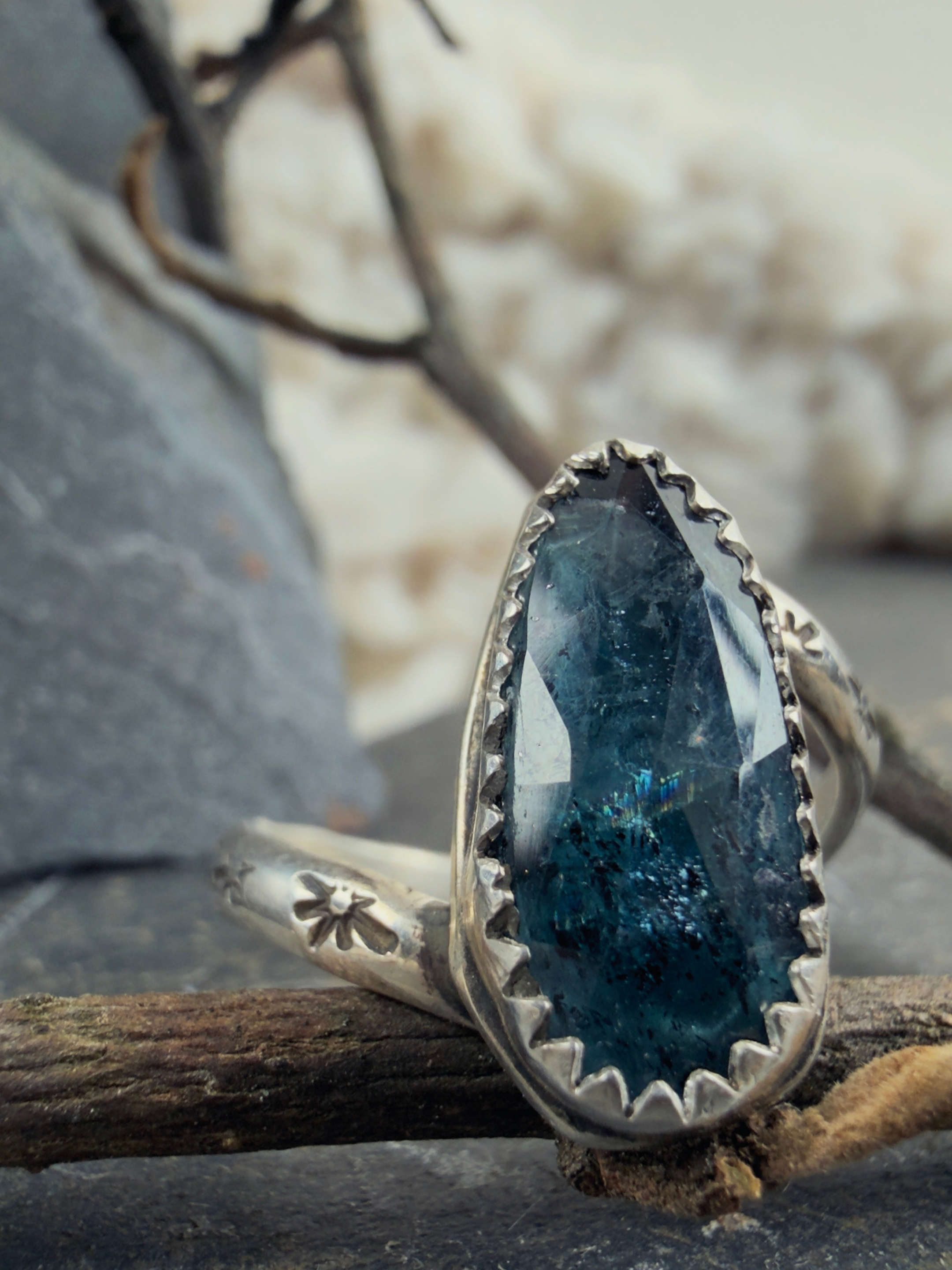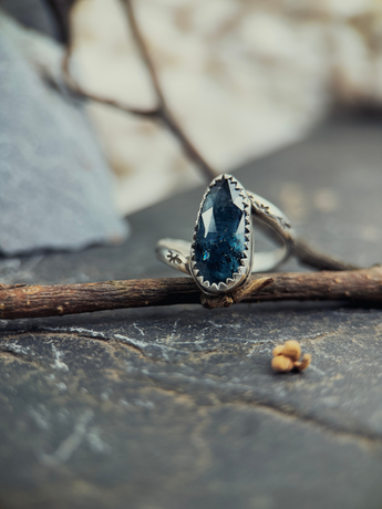 This ring holds that knowing. Teal kyanite glows like the brightest thing in the room, faceted sharp so light moves through it and refuses to be ignored. The silver frame is simple, letting the stone do the work. Star embellishments trace the band like a constellation that only you can see. This is not subtle. This is not asking permission. This is you, fully lit.