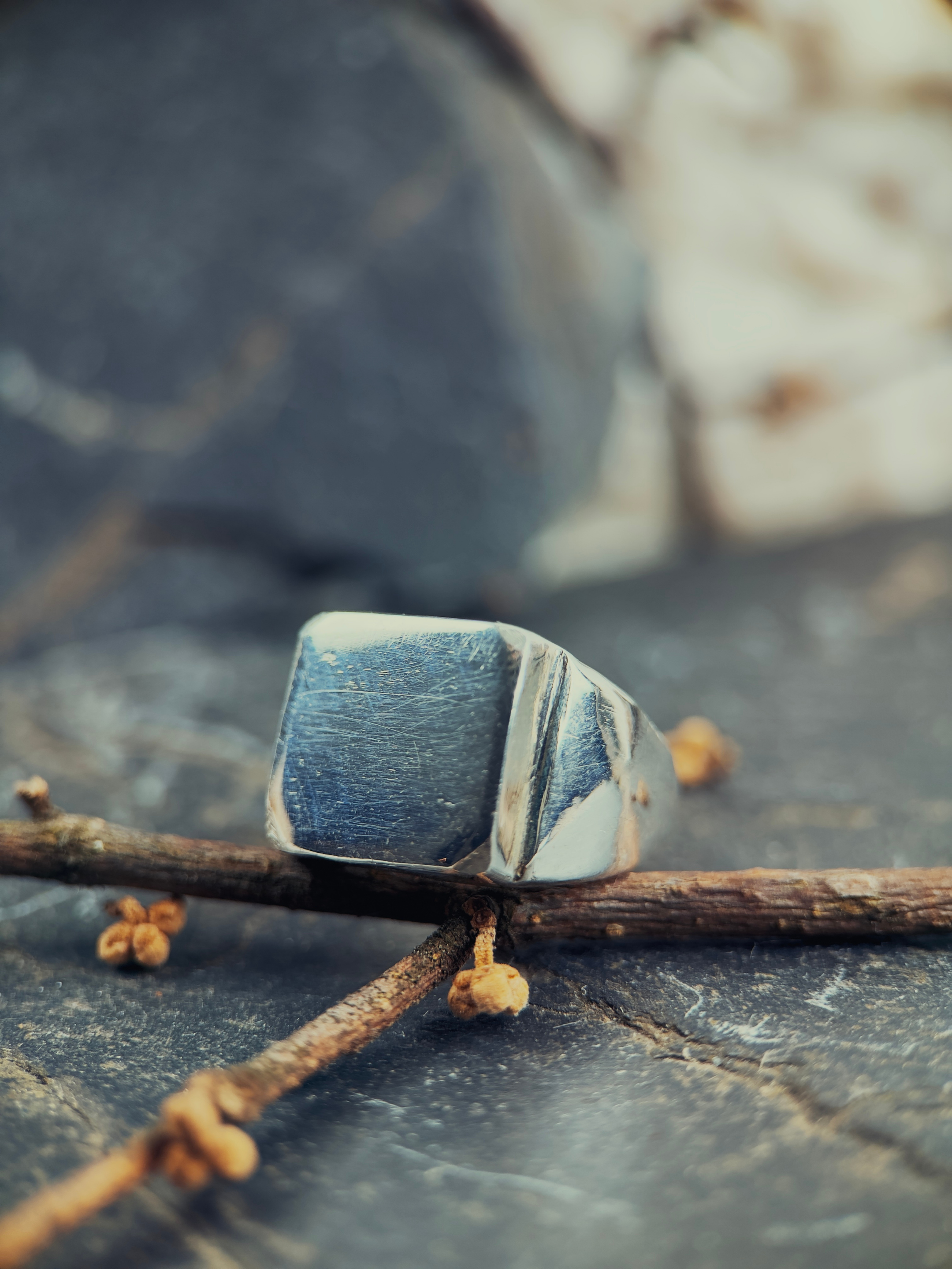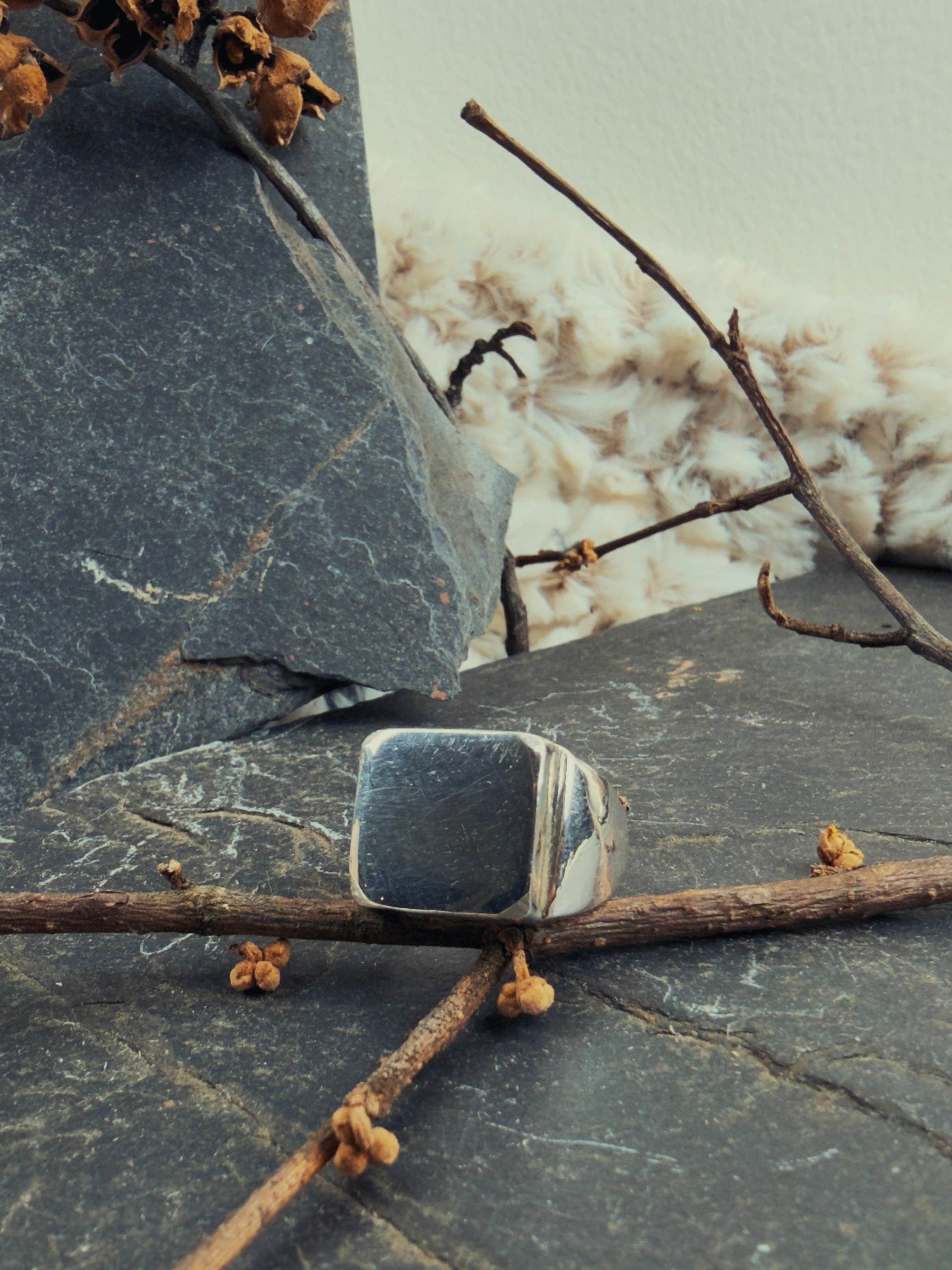 This ring is all sterling silver, high polish, carved from wax and sand cast in my home studio from recycled scraps. Every ounce of silver here has been reclaimed, reformed, made into something that matters. The signet shape is deliberate. It's a seal. It says this is yours. You made this. You own it.
